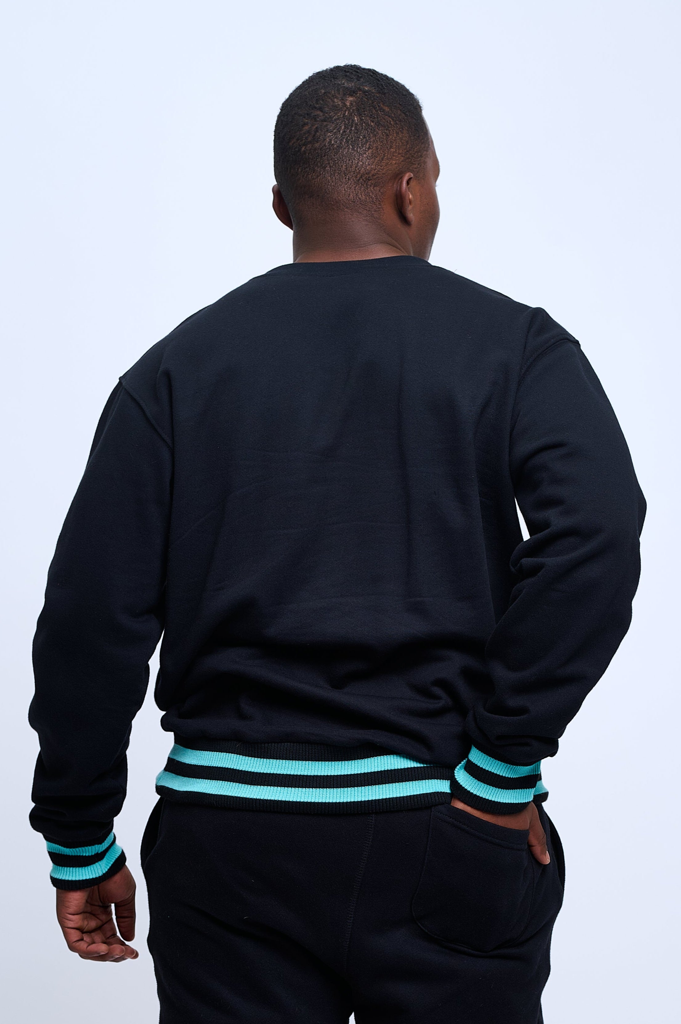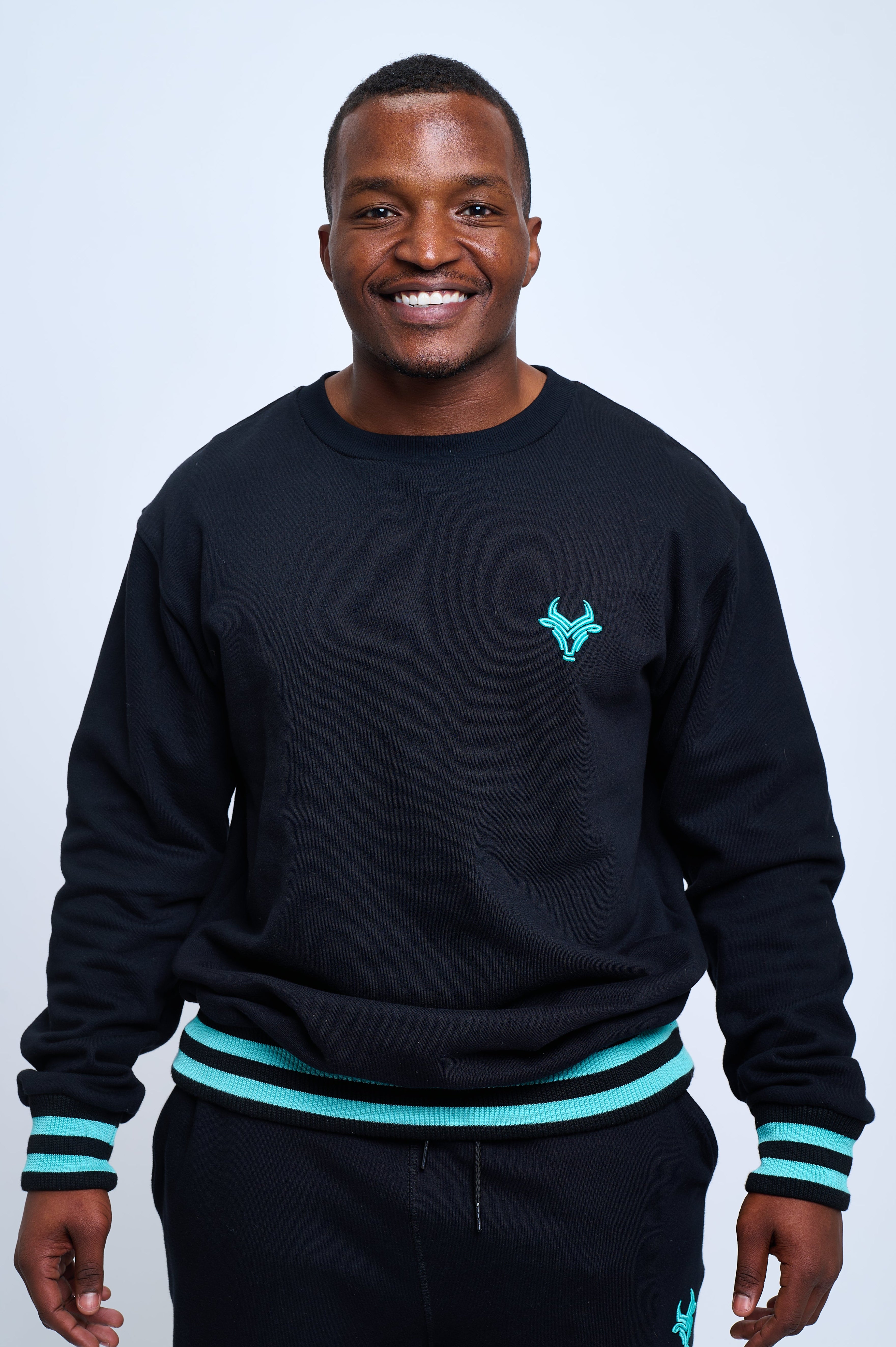 This heavyweight sweatshirt is made in 18oz fleece, comes with custom rib on both the sleeves, and the waistband. The bullhead logo in 3D embroidered on the left chest in a custom blue color that matches the ribbing. The collar is finished with black rib and also features neck tape that comes in red, with Bullish Mentality embroidery.